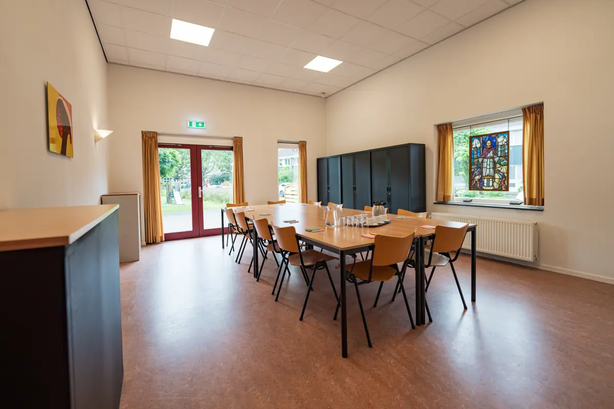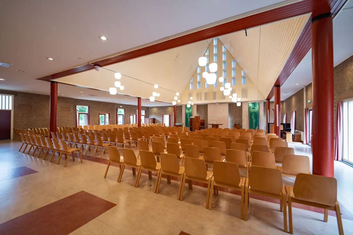 Deze moderne kerk kenmerkt zich door lichte, praktische ruimtes met hedendaagse voorzieningen. De kerkzaal accommodeert tot 300 personen met flexibele opstelling en groot TV-scherm voor presentaties. Drie wijkzalen op de begane grond kunnen apart of gecombineerd worden gehuurd, waarbij de gecombineerde ruimte plaats biedt aan 45 personen. De consistorie met vaste vergadertafel vormt een professionele setting voor bestuursvergaderingen. De aangrenzende speeltuin maakt de locatie kindvriendelijk, terwijl gratis parkeren in de buurt en eigen parkeerplaatsen het comfort voor bezoekers verhogen.