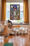 Functionele ruimte voor kleine vergaderingen en werkgroepen. Projectie direct op de wand mogelijk, beamer beschikbaar op aanvraag.