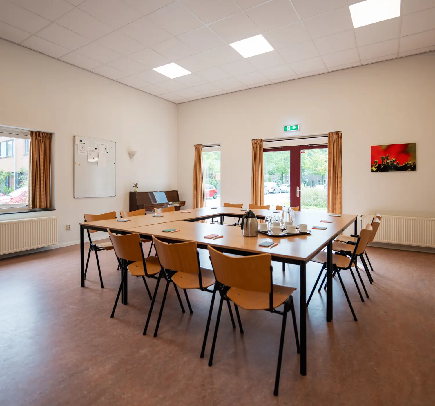 Functionele ruimte voor kleine vergaderingen en werkgroepen. Projectie direct op de wand mogelijk, beamer beschikbaar op aanvraag.