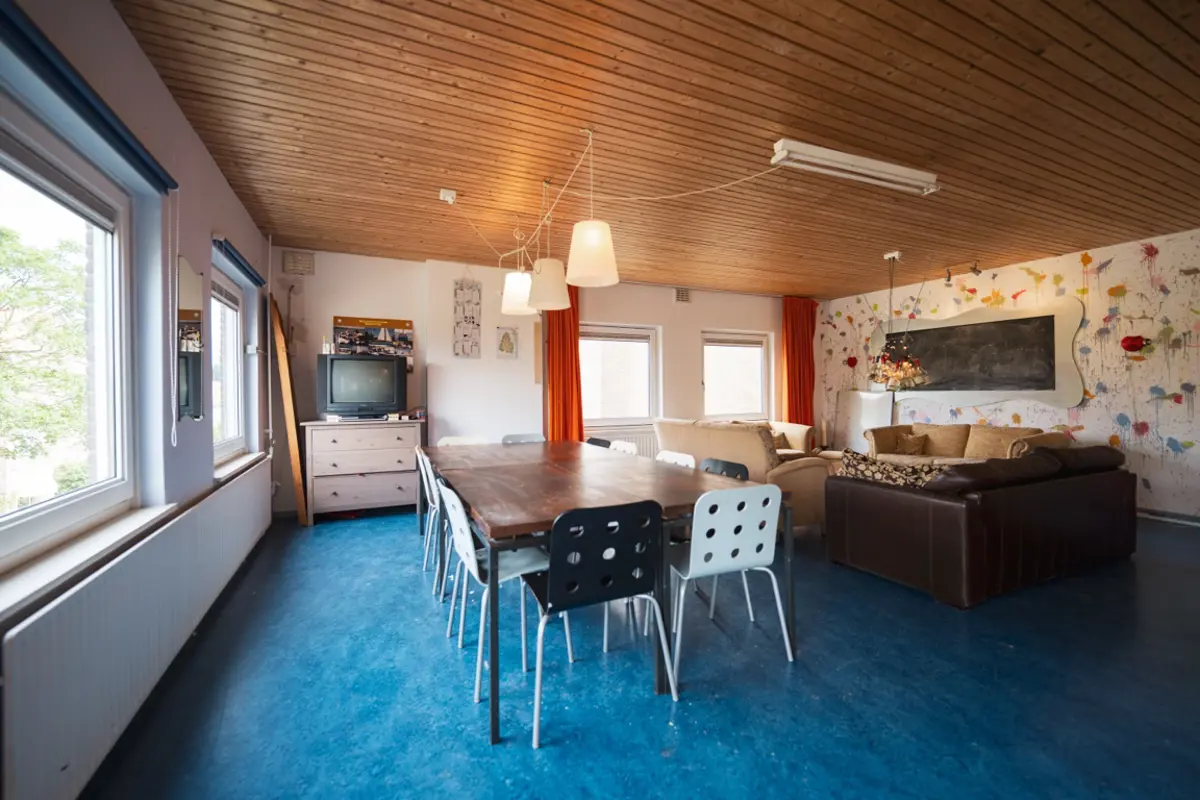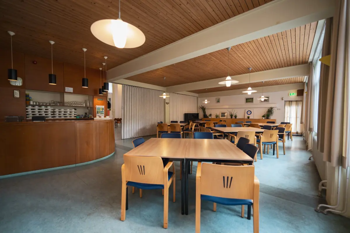 Informele ruimte met bankstel, stoelen en tafels voor jeugdactiviteiten van de wijkkerken. WiFi aanwezig, beamer en projectiescherm beschikbaar op aanvraag.