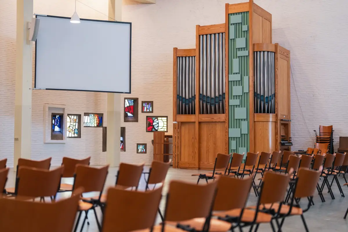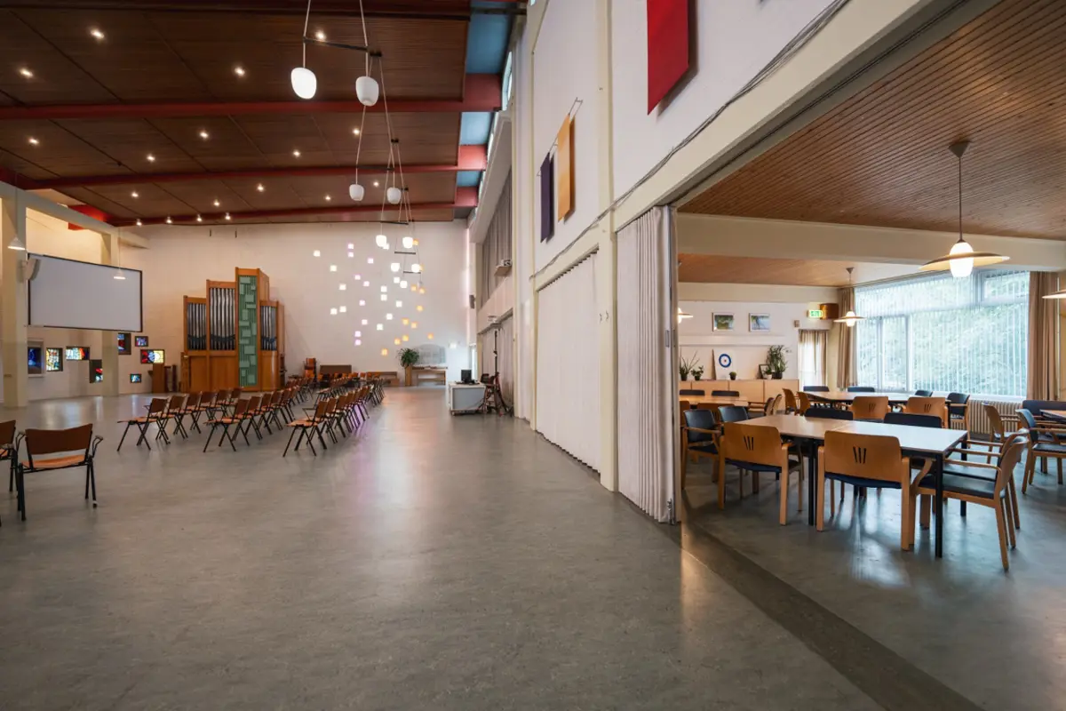Perfecte combinatie voor grote evenementen waarbij de foyer als pauzeruimte of ontvangst dient. Alle faciliteiten van de kerkzaal beschikbaar voor congressen, concerten en grote vieringen.