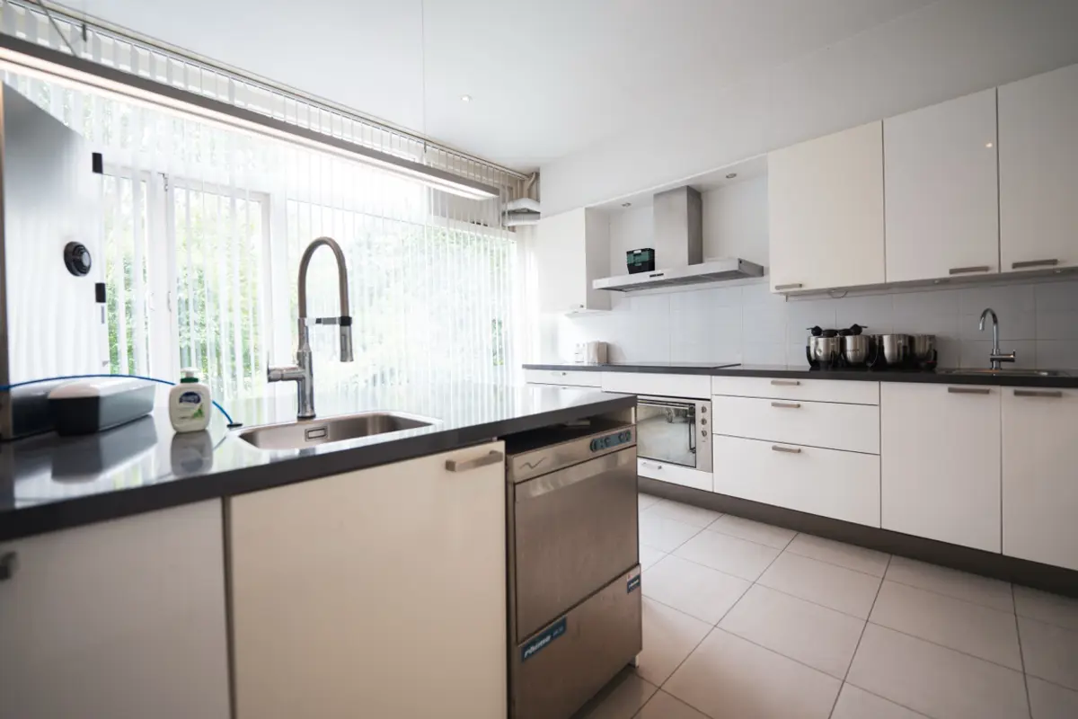 Professioneel uitgeruste keuken met snelvaatwasser, fornuis met oven en koffieautomaat. Ideaal voor catering bij evenementen in combinatie met kerkzaal of foyer.