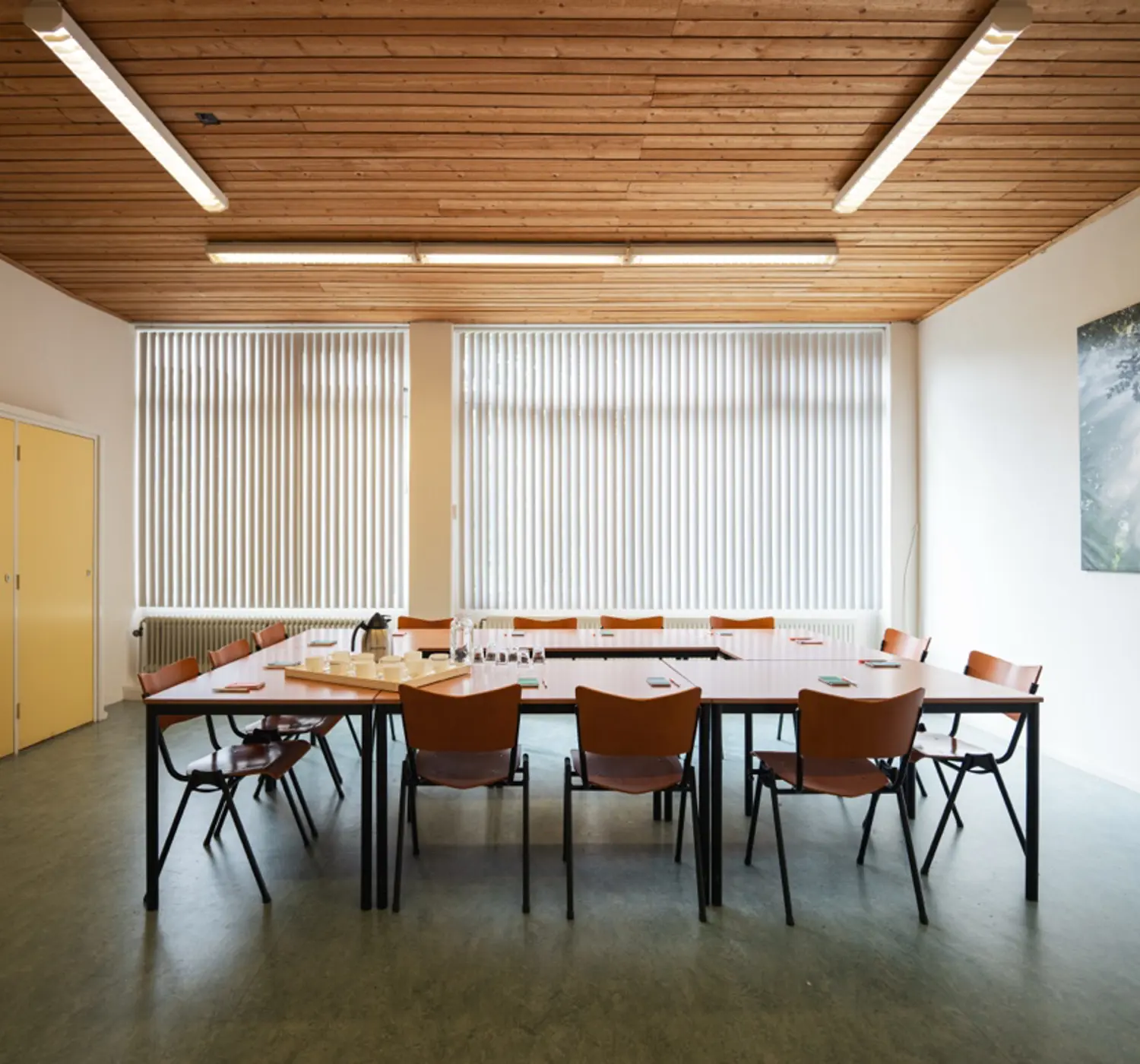 Praktische ruimte voor vergaderingen met beperkt aantal deelnemers, uit te breiden voor grotere groepen. WiFi standaard, losse beamer en projectiescherm beschikbaar op aanvraag.