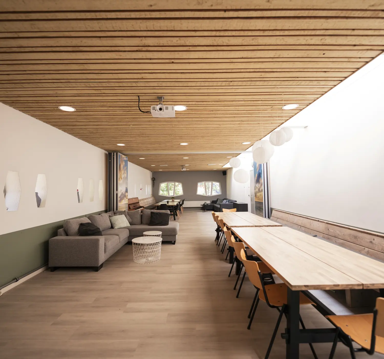 Tafels, stoelen, bankstellen, vaste beamer met projectie op een witte wand.
