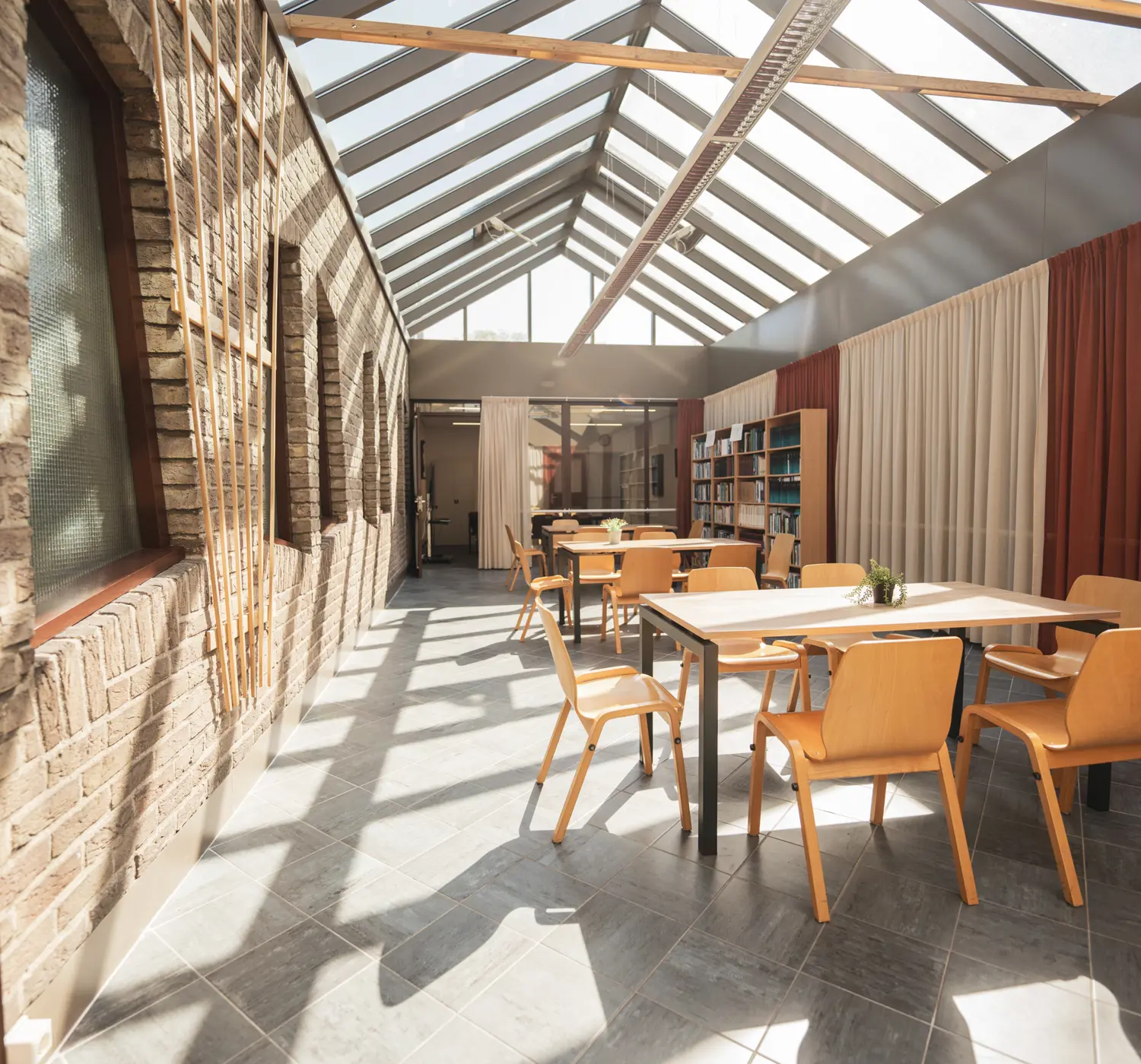 Over het algemeen wordt deze ruimte gebruikt voor kerkelijke activiteiten. In overleg zou deze ruimte beschikbaar zijn voor vergaderingen tot ca 10 personen. In de voorjaars/zomerperiode minder geschikt voor gebruik ivm glazen overkapping: de zaal kan dan erg warm worden.