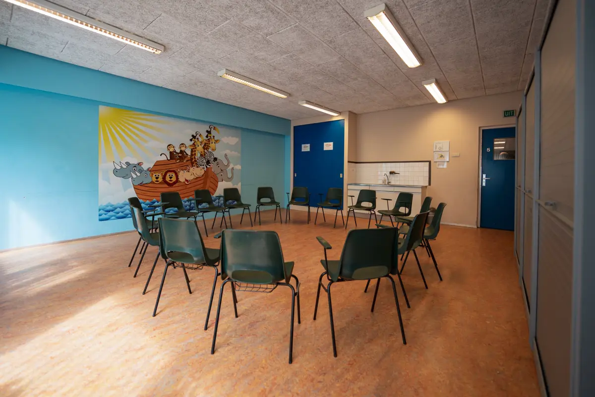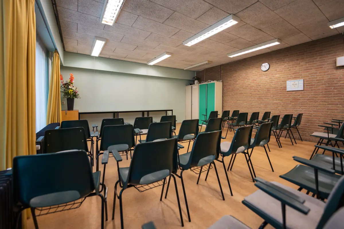 De centrale hal met aangrenzende keuken vormt het hart van dit gebouw, van waaruit alle ruimtes direct toegankelijk zijn. Het volledig gelijkvloerse gebouw maakt elke bijeenkomst toegankelijk voor iedereen, inclusief rolstoelgebruikers. Van de intieme vergaderzaal voor 12 personen tot de kerkzaal met 305 zitplaatsen: elke ruimte beschikt over wifi en kan worden uitgerust met beamer en geluidsversterking. Het ruime eigen parkeerterrein lost parkeerproblemen op, terwijl ringleiding in meerdere zalen het comfort voor slechthorenden waarborgt. De professionele keuken met snelvaatwassers maakt catering voor grote groepen mogelijk.