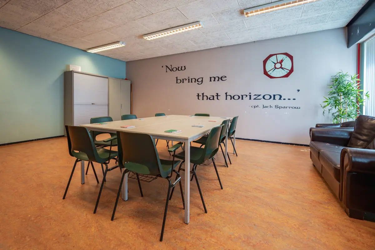 Informele ruimte met bankstel, geschikt voor kleinschalige vergaderingen en bijeenkomsten tot 10 personen uit te breiden naar 20 personen. Projectiescherm aanwezig, beamer beschikbaar op aanvraag.